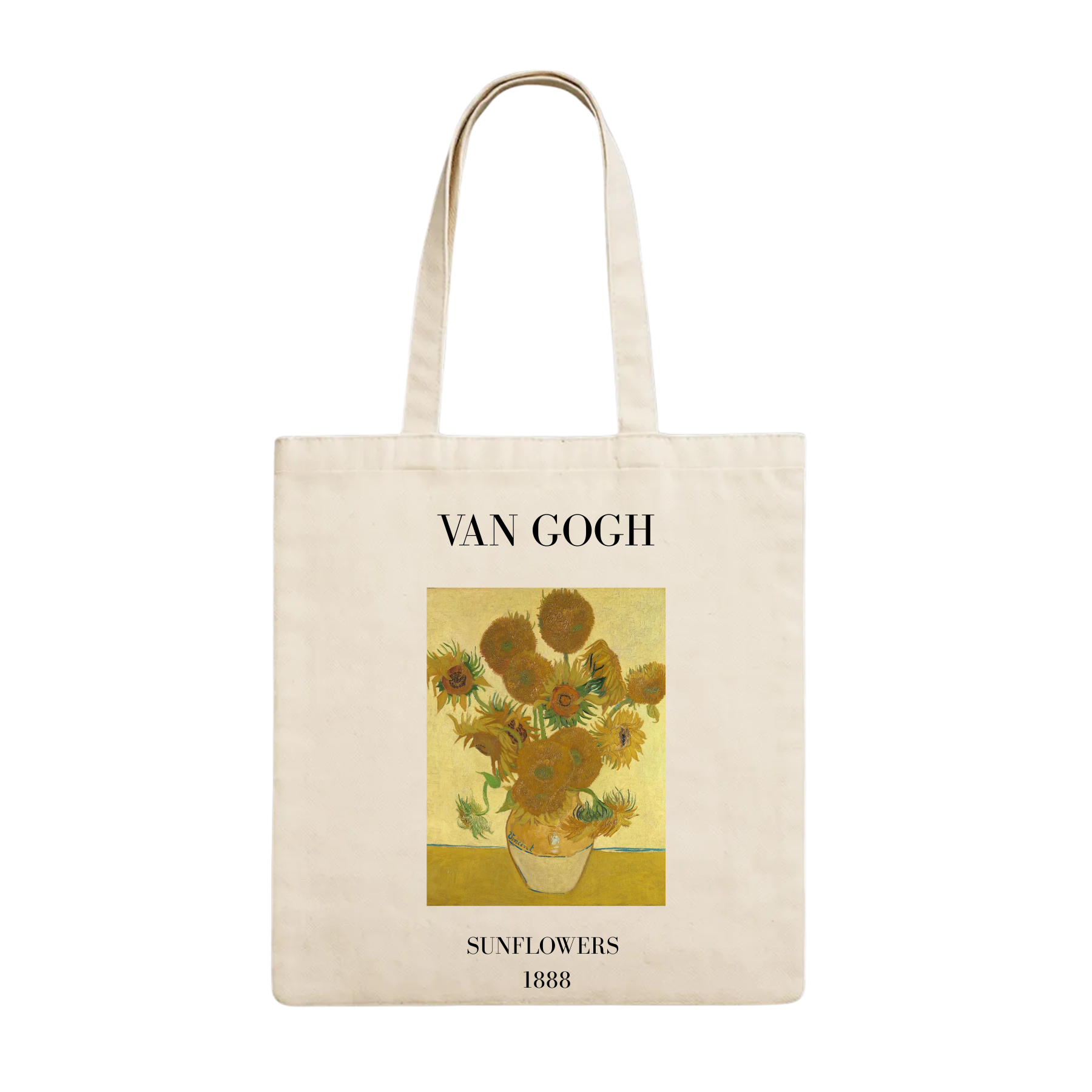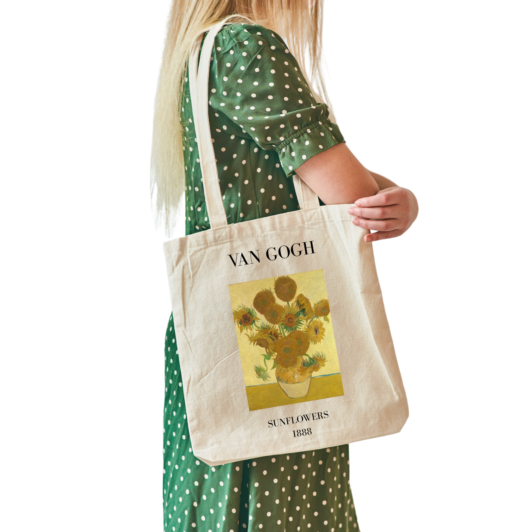 Diseño inspirado en SunFlowers de Van Gogh. Hecha en algodón 100% natural, resistente y reutilizable. Perfecta para el día a día: práctica, lavable y eco-friendly.